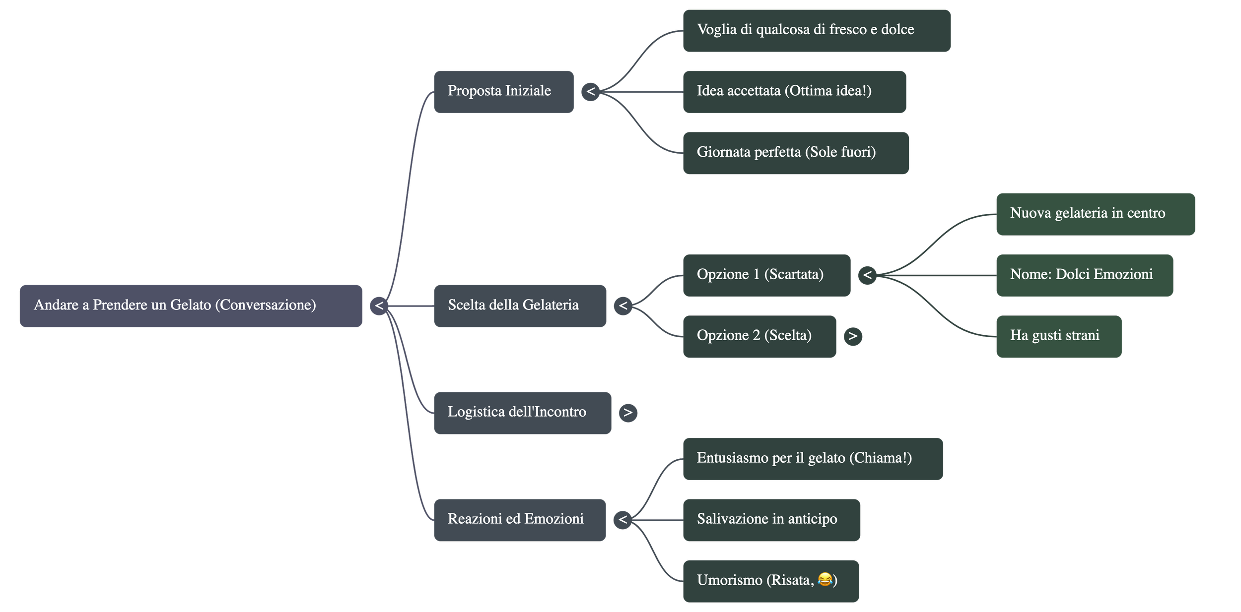 Identificazione. Il sistema ha individuato l’obiettivo principale del dialogo: “andare a prendere un gelato”. La conversazione prende avvio da una motivazione emotiva “una voglia incredibile di qualcosa di fresco e dolce” e dal contesto favorevole, “una giornata perfetta per un cono”.