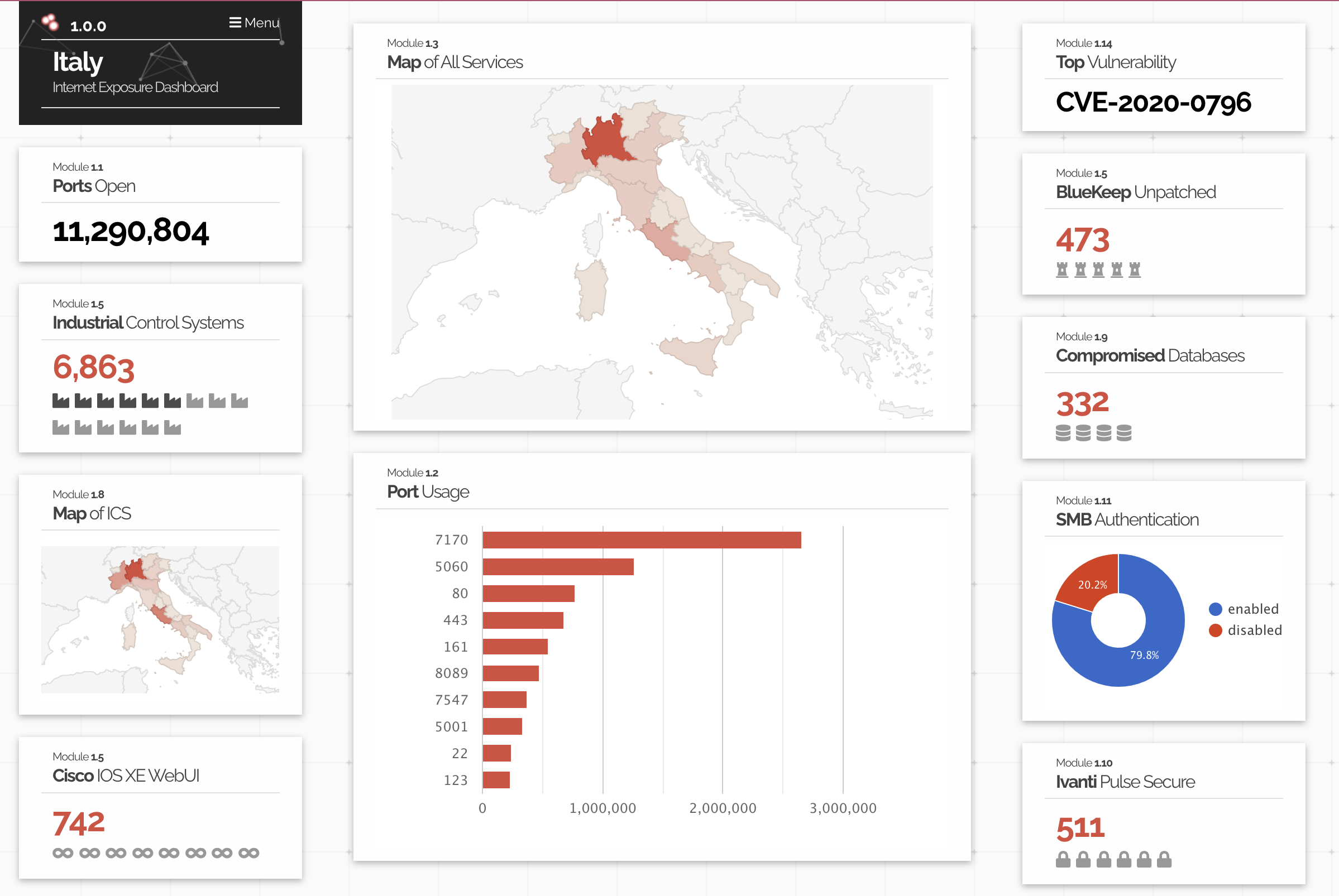 Ormai è finita l’epoca dei siti creati in modo casalingo con l’indirizzo di casa e numero di telefono del proprietario nel dettaglio del dominio, ora ci si rifà a grandi fornitori (come Squarespace, dove è hostato fattoreumano.org, Wordpress, etc) che proteggono - nella maggior parte dei casi - le informazioni e che tutelano anche la loro infrastruttura. Facendo un reverse dell’indirizzo IP di fattoreumano.org - ad esempio - potrebbe uscirvi un IP che su Shodan in realtà compare associato a qualcunaltro, proprio perchè il TTL è di 4h (e quindi ogni 4h viene cambiato e associato ad altro). Vediamo un po’ da lontano cosa possiamo trovare su Shodan cercando, ad esempio, la mappa dei servizi esposti in Italia (immagine qui sotto, ref: https://exposure.shodan.io/#/IT). Questa fotografia solitamente fa sentire meno soli i manager di Aziende che sono appena state bucate proprio a causa di uno di questi servizi esposti.